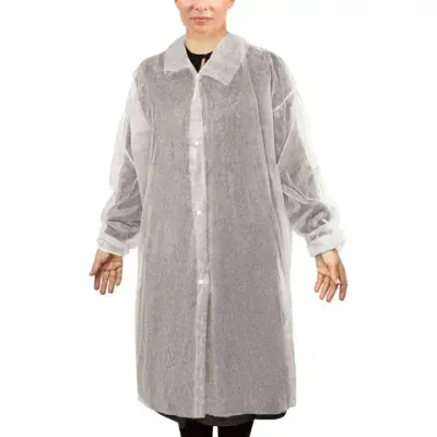 Нетканый халат ОПТИТРЕЙД с кнопочной застежкой и рукавами на резинке – это защитная одежда для работников, которые могут подвергаться химическому или биологическому воздействию, брызгам и испарениям.