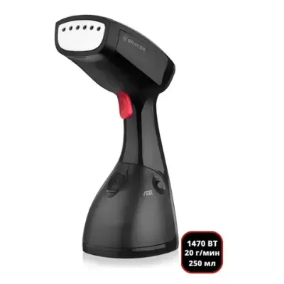 - Какие характеристики у Отпариватель ручной BRAYER BR4122, 1470 Вт, 20 г/мин, резервуар 0,25 л, 1 режим, черный?