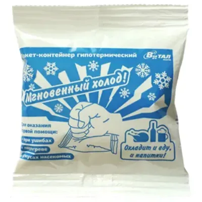 Показания: при травмах (переломах, ушибах, растяжении связок, вывихах), при тепловом или солнечном ударе, при ожогах (без повреждения кожных покровов), при несильных капиллярных или носовых кровотечениях, при подозрении на повреждения внутренних органов, при укусах насекомых. Изделие для однократного применения. Способ применения: 1. Расположить изделие на ровной поверхности. 2. Раздавить внутренний пакет с водой. 3. Встряхнуть для лучшего смешивания компонентов. 4. Приложить к пострадавшему
