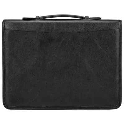 Распашная деловая папка на молнии снабжена объемным карманом на кнопке, плоским карманом на молнии и карманом для блокнота. Дополнительные отделения для визиток и пишущих принадлежностей. 4-кольцевой механизм для перфорированных папок.