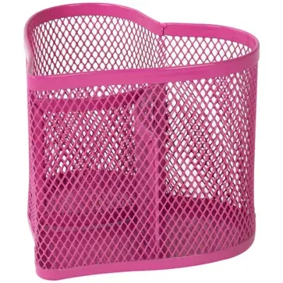 Изготовлена из металлической сетки розового цвета в форме сердца. Имеет размеры 105х118х95 мм. Состоит из трех отделений. Мягкие подушечки на дне предотвращают скольжение и порчу мебели. Поставляется без канцелярского наполнения.