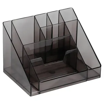 Прочный корпус, гладкая глянцевая поверхность. Девять отделений позволяют хранить множество канцелярских мелочей и пишущих принадлежностей. Изделие высотой 10,3 см, основанием 15,8*11,5 см выполнено из качественного пластика. Цвет - тонированный черный.