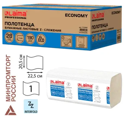 - Полотенца бумажные 190 шт., КОМПЛЕКТ 28 пачек, LAIMA ECONOMY (H2), Z-сложение, натуральный цвет, 22,5х20,5 см, 115360 — это продукция бренда LAIMA. В нашем магазине представлен широкий ассортимент товаров LAIMA.