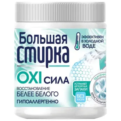 - Основные характеристики Пятновыводитель-отбеливатель кислородный для белого 400 г, БОЛЬШАЯ СТИРКА, 26456: Тип средства: пятновыводитель, Назначение: для белого белья, Серия: Oxi Action, Вид упаковки: банка. Полный список характеристик доступен на странице товара.
