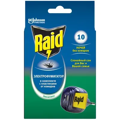- Комплект фумигатор+10 пластин от комаров Raid с ароматом "Эвкалипт", картонная коробка с европодвесом — это продукция бренда Raid. В нашем магазине представлен широкий ассортимент товаров Raid.