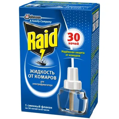 - Жидкость от комаров для фумигатора Raid, 30 ночей, картонная коробка — это продукция бренда Raid. В нашем магазине представлен широкий ассортимент товаров Raid.