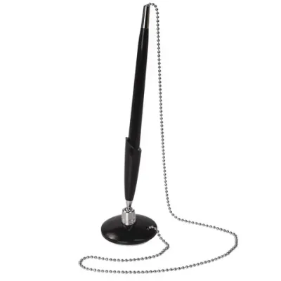 Корпус ручки и подставки выполнен из пластика черного цвета с хромированными деталями. Ручка крепится к подставке с помощью крепкой цепочки и фиксируется на любой ровной поверхности с помощью клейкого основания. Длина стержня составляет 130 мм. Диаметр основания - 5 см. Создает линию письма толщиной 0,5 мм.