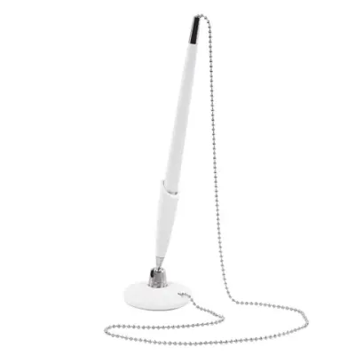 Корпус ручки и подставки выполнен из пластика белого цвета с хромированными деталями. Ручка крепится к подставке с помощью крепкой цепочки и фиксируется на любой ровной поверхности с помощью клейкого основания. Длина стержня составляет 130 мм. Диаметр основания - 5 см. Создает линию письма толщиной 0,5 мм. Цвет чернил - синий.