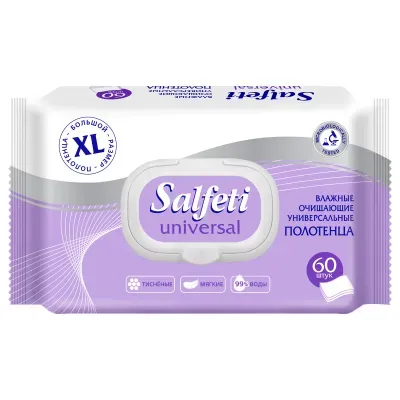 - Полотенца влажные XL 60 шт., 18х25 см, SALFETI "Universal", универсальные, крышка-клапан, 72586 — это продукция бренда SALFETI. В нашем магазине представлен широкий ассортимент товаров SALFETI.