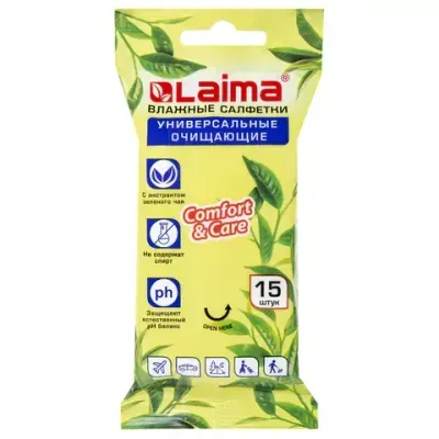 - Салфетки влажные 15 шт., УНИВЕРСАЛЬНЫЕ, очищающие, с экстрактом зеленого чая, LAIMA, 125956 — это продукция бренда LAIMA. В нашем магазине представлен широкий ассортимент товаров LAIMA.