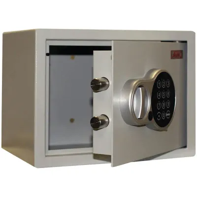 Сейф изготовлен из стали. Лицевая панель толщиной 2,8 мм, боковые стенки с толщиной металла 1,2 мм. На сейф установлен электронный кодовый замок PLS-3 (Россия) со световой и звуковой индикацией, позволяющий запрограммировать свой уникальный код (от 4 до 8 знаков). В комплект входит аварийный мастер-ключ на случай, если забыли код или вышли из строя элементы питания. Подробная инструкция по эксплуатации замка в комплекте. Изделие имеет ригельную систему запирания, при этом диаметр ригел