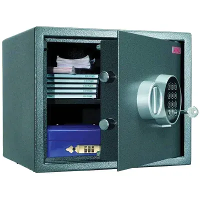 Сейф изготовлен из стали. Лицевая панель толщиной 2,8 мм, боковые стенки с толщиной металла 1,2 мм. На сейф установлен электронный кодовый замок PLS-3 (Россия) со световой и звуковой индикацией, позволяющий запрограммировать свой уникальный код (от 4 до 8 знаков). В комплект входит аварийный мастер-ключ на случай, если забыли код или вышли из строя элементы питания. Подробная инструкция по эксплуатации замка в комплекте. Изделие имеет ригельную систему запирания, при этом диаметр риге