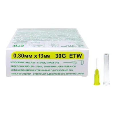Игла стерильная 0,3 х 13 мм 30G ETW SFM. ETW – экстратонкая стенка. Иглы стерилизованы оксидом этилена и поставляются в герметичных упаковках, которые легко открываются. Одноразовые иглы изготавливаются из хромо-никелевой стали, а колпачок сделан из медицинского полипропилена. Острие иглы имеет лазерную заточку, каждая грань трижды шлифуется ультразвуком, игла трижды покрывается силиконом. Благодаря такой технологии, игла входит в ткань не разрезая, а раздвигая волокна. Силиконовое покрытие