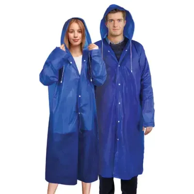 Дождевик-плащ универсального размера с капюшоном изготовлен из этиленвинилацетата (EVA). Поверхность дождевика рельефная. Застегивается на 6 пар кнопок из полипропилена (PP). В капюшоне есть кулиска с пластиковыми наконечниками. Рукава сужаются книзу. Края рукавов, полочек и низ изделия подогнуты и надежно проклеены. Чехол на кулиске для хранения дождевика из EVA материала – в комплекте. Перед помещением плаща в чехол для хранения изделие необходимо хорошо просушить. Для многоразового использо