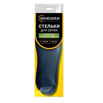 - Цена на Стельки для обуви АНАТОМИЧЕСКИЕ С МАССАЖНЫМ ЭФФЕКТОМ, материал PU PRO, размер RU 34-39 / EU 35-40, с линиями выреза, SHEGRA (ШЕГРА), 700742 составляет 211,51 рублей. При оптовом заказе цена от 171,25 рублей.
