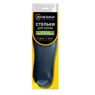 - Цена на Стельки для обуви АНАТОМИЧЕСКИЕ С МАССАЖНЫМ ЭФФЕКТОМ, материал PU PRO, размер RU 39-44 / EU 40-45, с линиями выреза, SHEGRA (ШЕГРА), 700741 составляет 211,51 рублей. При оптовом заказе цена от 171,25 рублей.