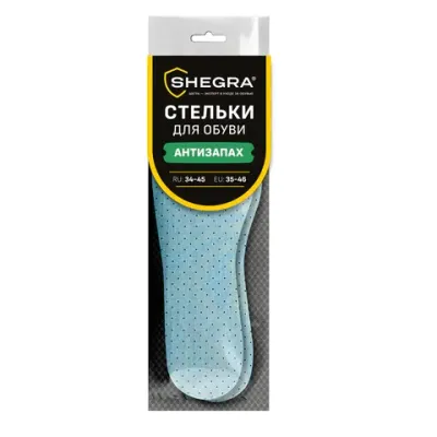 - Стельки для обуви АНТИЗАПАХ, УНИВЕРСАЛЬНЫЙ размер RU 34-45 / EU 35-46 с линиями выреза, SHEGRA (ШЕГРА), 700732 — это продукция бренда SHEGRA. В нашем магазине представлен широкий ассортимент товаров SHEGRA.
