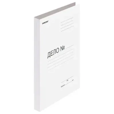 Подходит для документов формата А4 и меньше. Изготовлен из белого немелованного картона плотностью 280 г/м2. Оснащен металлическим механизмом сшивания. Вмещает до 200 листов стандартной плотности. Имеет надпись "Дело №" на обложке. Поставляется в гофрокоробе.