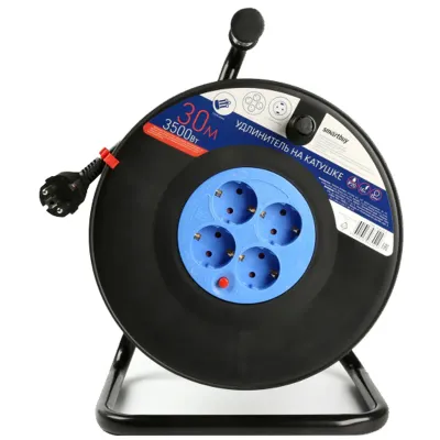- Удлинитель на катушке силовой Smart Buy, 30 метров, с заземлением, предохранитель, 4 гнезда, ПВС 3*1,5, 16А/3,5кВт — какой бренд?