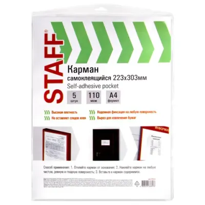 - Карманы самоклеящиеся на любую поверхность ФОРМАТ А4 223х303 мм, КОМПЛЕКТ 5 шт., STAFF, 270570 — это продукция бренда STAFF. В нашем магазине представлен широкий ассортимент товаров STAFF.
