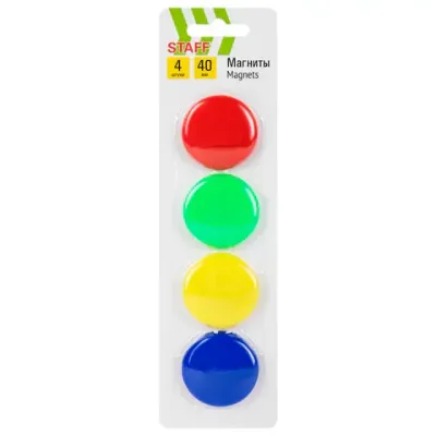 Магниты БОЛЬШОГО ДИАМЕТРА, 40 мм, НАБОР 4 штуки, цвет АССОРТИ, в блистере, STAFF "Basic", 237484