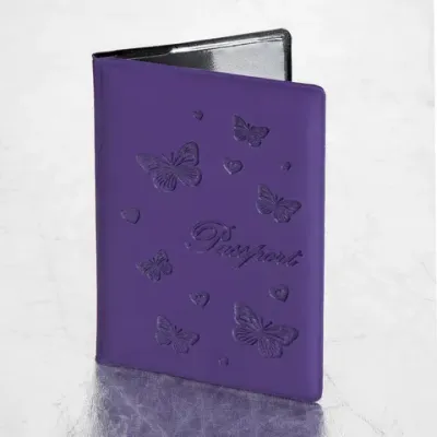 Модель выполнена из бархатного полиуретана фиолетового цвета, украшена изображением бабочек и тисненой надписью "Паспорт". На внутреннем развороте расположены два кармана из прозрачного пластика. Благодаря компактным размерам 97х138 мм удобно всегда носить с собой.