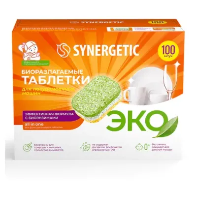 Таблетки для посудомоечных машин 100 шт. SYNERGETIC, биоразлагаемые, бесфосфатные, 102100