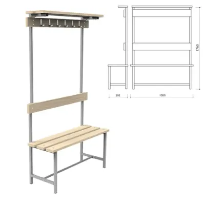 Скамья с вешалкой, спинкой и полкой предназначена для эксплуатации в раздевалках спортивных учреждений, предприятий, офисов. Металлический каркас и доски из натуральной древесины обеспечивают надежность и долговечность эксплуатации. Простая сборка.