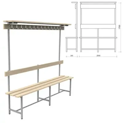 - Цена на Скамья с вешалкой, спинкой и полкой "СВТ 9", 1760х2000х395 мм, 14 крючков, регулируемые опоры, каркас металлический серый, сиденье дерево составляет 9 494,73 рублей.