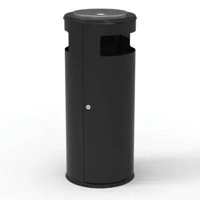 Урна Метрополь-2 изготовлена из стали с порошковым покрытием. Имеет створку с замком, для доступа к пакету с мусором закрепленному на специальном кольце. Крышка снабжена емкостью для окурков. В основание предусмотрено отверстием для анкерного крепления.