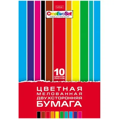 - Основные характеристики Цветная бумага А4 2-сторонняя мелованная, 10 листов, 10 цветов, в папке, HATBER, 200х290 мм, "Creative Set", 067536, 10Бц4м_07263: Дизайн ассорти: нет, Дизайн: Creative Set, Цвет: ассорти, Количество цветов: 10. Полный список характеристик доступен на странице товара.