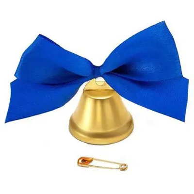 Металлический золотой колокольчик для выпускника, с синим тканевым бантиком; крепится сзади на булавку. Булавка в комплекте.
