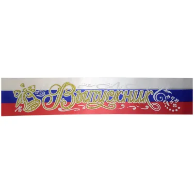 Лента выпускника в цвете триколор выполнена из атласного материала и имеет размер 10*190см. Выбивная надпись 3D украшена блёстками и объемной обводкой. Ленты упакованы в пакет по 10 шт.