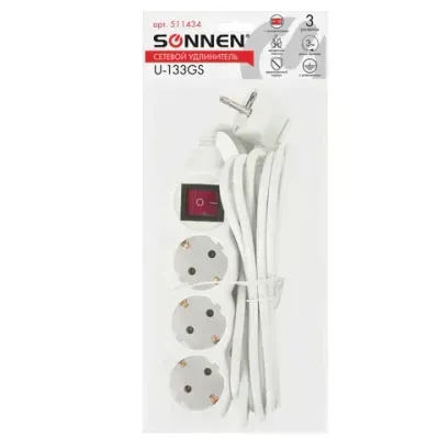 - Цена на Удлинитель сетевой SONNEN U-133GS, 3 розетки, c заземлением, выключатель, 10 А, 3 м, белый, 511434 составляет 455,34 рублей. При оптовом заказе цена от 450,2 рублей.