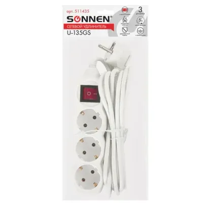 - Удлинитель сетевой SONNEN U-135GS, 3 розетки, c заземлением, выключатель, 10 А, 5 м, белый, 511435 — это продукция бренда SONNEN. В нашем магазине представлен широкий ассортимент товаров SONNEN.