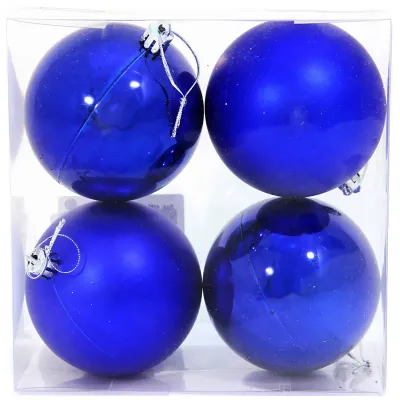 Набор из 4-х новогодних шаров размером 8 см. В наборе матовые и глянцевые шары. Цвет - синий. Упаковка - прозрачная ПВХ коробка. Материал шаров - пластик. Размер упаковки 16x16x8 см.