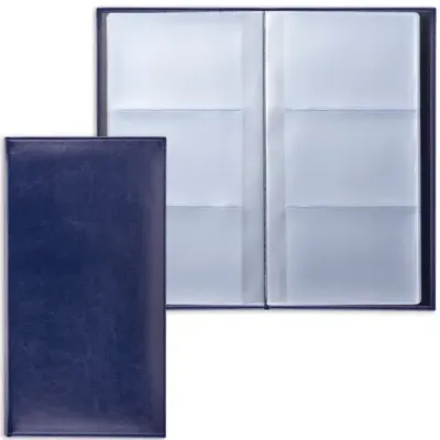 Обложка из материала под гладкую кожу, прошита по периметру. Подходит для горячего тиснения. Содержит 72 кармана из мягкого ПВХ с антибликовой фактурой на 144 визитные карточки или 72 кредитные и дисконтные карты. Размер изделия - 115х200 мм.
