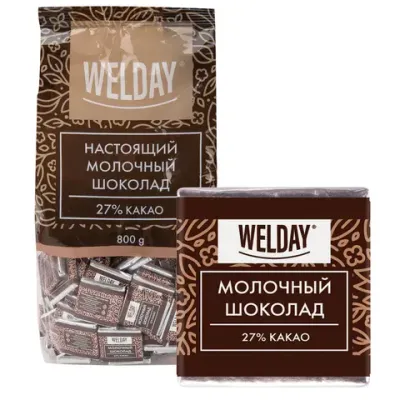 Шоколад порционный высшего качества WELDAY (ВЭЛДЭЙ) "Молочный 27%", 800 г (160 плиток по 5 г), пакет, 622406