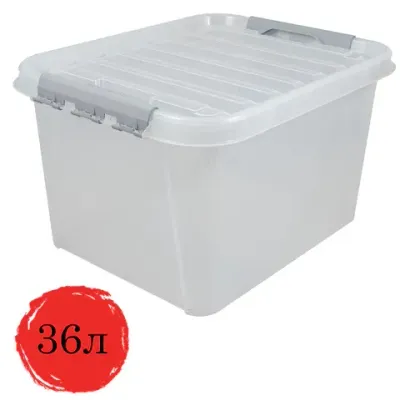 Ящик-контейнер 36 л с КРЫШКОЙ НА ЗАЩЕЛКАХ "ПРОФИ", 29х50х39 см штабелируемый, ПРОЧНЫЙ, прозрачный, 437950000