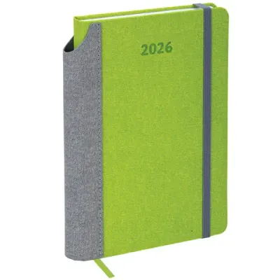 Внутренний блок включает 168 листов белой бумаги плотностью 70 г/м2. Каждая страничка имеет перфорированный угол. Благодаря стандартному формату А5 (138х213 мм) ежедневник удобно использовать как в офисе, так и на выездных деловых встречах. Выполнен в стильном сочетании зеленого и серого цветов. Жесткая книжная обложка стилизована под искусственную кожу с текстурой льна, фиксируется резинкой, поэтому ежедневник не откроется в сумке или портфеле и страницы не помнутся. Материал обложки подходит