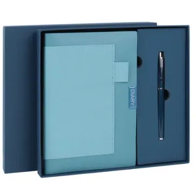 Подарочный набор включает в себя недатированный ежедневник с внутренним блоком из 160 листов кремовой бумаги плотностью 70 г/м2. Каждая страничка имеет перфорированный угол. Благодаря классическому формату А5 (144x210 мм) ежедневник удобно использовать как в офисе, так и на выездных деловых встречах. Гибкая обложка стилизована под текстурную кожу. Дополнениями являются закладка-ляссе и держатель для ручки. Ручка со стильным корпусом в тон ежедневника и высококачественными чернилами также входит