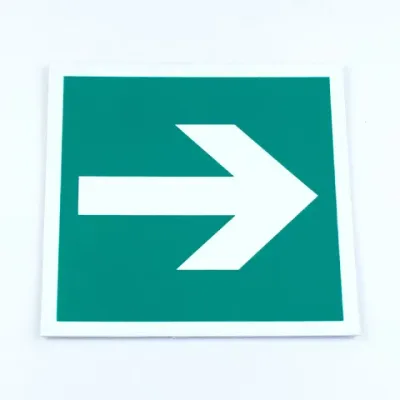 Эвакуационный знак "Направляющая стрелка" используется только вместе с другими эвакуационными знаками. Применяется в качестве эвакуационной пиктограммы для световых указателей выхода. Изготавливается на белой самоклеящейся пленке.