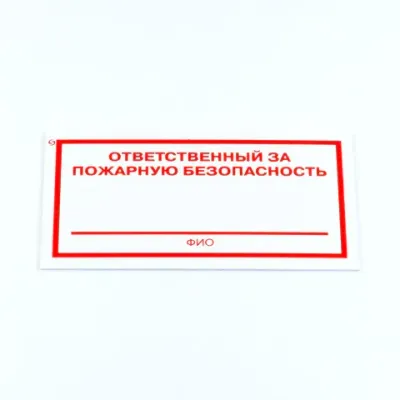 - Основные характеристики Знак "Ответственный за пожарную безопасность", КОМПЛЕКТ 3 штуки, 100х200х2 мм, пластик, F21: Материал: пластик, Тип знака: вспомогательный, Ширина: 200, Высота: 100. Полный список характеристик доступен на странице товара.
